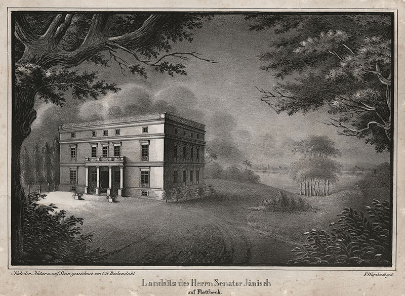 1828 verkaufte Baron Voght sein Landgut an den Kaufmann und Bausenator Martin Johann Jenisch (1793-1857), einen der vermögendsten Männer Hamburgs. Ihn interessierte nicht die Landwirtschaft, vielmehr suchte er einen Bauplatz für eine repräsentative Villa. Errichtet wurde sie 1831 bis 1834 nach Plänen des Hamburger Architekten Franz Gustav Forsmann (1795-1878) und unter Einbeziehung von Änderungsvorschlägen des Berliner Architekten Karl Friedrich Schinkel (1781-1841). Es entstand ein klassizistisches Herrenhaus – ein sachlich anmutendes quadratisches Blockgebäude mit Flachdach und vergoldeten Ziergittern. Zur Gartenseite öffnet es sich mit dorischen Säulen und einer Freitreppe auf eine weit auslaufende Rasenfläche zur Elbe hin. Seit 1953 gehört das Jenisch-Haus zum Altonaer Museum. Im Erdgeschoss befinden sich repräsentative Säle und ein Café. In den oberen Stockwerken werden wechselnde Ausstellungen, insbesondere zur Kunst- und Kulturgeschichte des 19. Jahrhunderts, gezeigt.