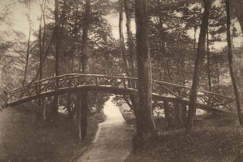 In dem Gebiet, auf dem die „ornamented farm“ angelegt wurde, gab es Wasserläufe, Hügel und Wälder. Die unterschiedliche Beschaffenheit wie Trockenheit auf dem Geestrücken und sumpfiges Gebiet in den Moorwiesen waren für die Anlage der Nutzflächen ungünstig. Hier musste aufwendig gedüngt, be- oder entwässert werden. In den Bereichen, die zur Parkanlage werden sollten, leisteten die Gegebenheiten hingegen der Idee des englischen Landschaftsgartens Vorschub: Durch ein ausgeklügeltes Wegenetz aus geschwungenen Pfaden erschlossen sich Parkbesuchenden immer neue Landschaftseindrücke, besondere Blickbeziehungen und überraschende Panoramen. Sogenannte Parkarchitekturen aus natürlichen Baumaterialien lenkten den Blick in bestimmte Richtungen oder betonten reizvolle Plätze. Dazu gehört auch die „Hohe Brücke“, die ursprünglich aus Baumstämmen und Ästen gefertigt war. Sie überspannt ein Tal, in dem bei ihrer Errichtung ein Landwirtschaftsweg verlief. Auch wenn die heutige Brücke eine mit Robinienholz verkleidete Stahlkonstruktion aus dem Jahr 2015 ist, wird sie immer noch als „Knüppelbrücke“ bezeichnet.