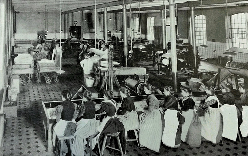 Im Werkssaal des Spinnerei-Gebäudes und in der Zwirnerei wurde Rohwolle aus Holstein, England und Übersee zu dem bekannten „Sternwollgarn“ weiterverarbeitet. Diese Arbeit verrichteten überwiegend Frauen. Danach wurden die Garne für den Versand in alle Welt verpackt. Während des Zweiten Weltkrieges wurden bei der Bombardierung 1943 Teile der Fabrik zerstört. Nach dem Krieg nahm die Garn-Produktion rasch wieder Aufschwung. Mit dem Niedergang der Textilindustrie durch die Konkurrenz in Billiglohnländern in den 60er Jahren ging auch die Sternwollspinnerei in Konkurs. Auf der gegenüberliegenden Straßenseite, Friesenweg 5, befindet sich das ehemalige Kontorhaus der bis 1917 dort ansässigen „Friesenbrauerei“. Es steht unter Denkmalschutz.